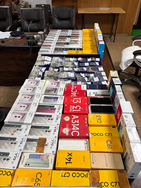 01. 96 नग मोबाईल कीमती 12,10,400- रूपये, 02. सोने के 43.4 ग्राम आभूषण वर्तमान कीमती 5,16,000 – रूपये एवं चॉंदी के आभूषण व मुर्तिया 2.109 कि.ग्रा. वर्तमान कीमती 3,29,120- रूपये जूमला कीमती 8,45,120 -रूपये, 03. नगदी रकम 57,000 -रूपये, 04. कुल बरामद मशरूका 21,12,520 – रूपये।