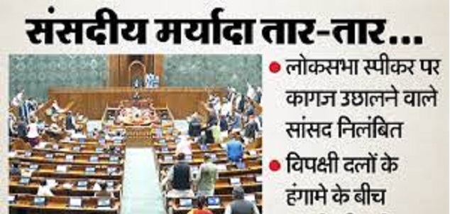 नई दिल्ली – संसद की कार्यवाही के दौरान मंगलवार सदन की मर्यादा टूटने का मामला सामने आया। लोकसभा में हंगामे के बीच कुछ सांसदों ने स्पीकर की कुर्सी की ओर कागज फेंके। इस पर सख्त कार्रवाई करते हुए संबंधित सांसदों को सत्र की शेष अवधि के लिए निलंबित कर दिया गया। आठ सांसदों पर ये कार्रवाई हुई है। भारी शोर-शराबे और विरोध के कारण सदन की कार्यवाही कई बार रोकनी पड़ी। वहीं, कार्यवाही कल यानी बुधवार तक के लिए स्थगित कर दी गई है।