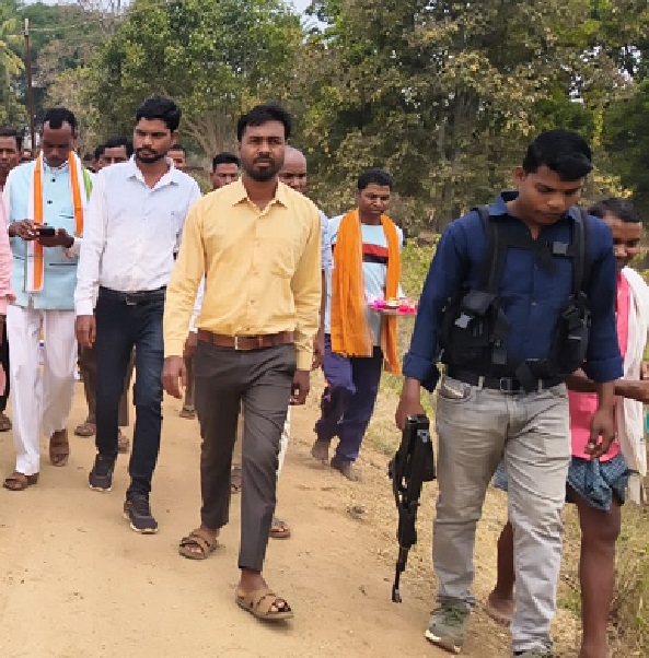 गरियाबंद – गरियाबंद जिले के आदिवासी विकासखण्ड मैनपुर क्षेत्र के बिहड़ जंगल और ओड़िसा सीमा में बसे ग्राम पंचायत गौरगांव के आश्रित ग्राम गेदराबेड़ा एवं लाटापारा में 25 वर्षो बाद पहलीबार आज राविवार को बिन्द्रानवागढ़ विधानसभा क्षेत्र के MLA जनक ध्रुव सुबह 11 बजे पहुंचे तो ग्रामीणों की खुशी का ठीकाना न रहा ग्रामीणों ने अपने बीच MLA को पाकर खुशी से गदगद हो गए और गाजे बाजे और पारम्पारिक रूप से ऐतिहासिक स्वागत किया। लगभग 1 कि.मी. दूर से स्वागत कर पैदल कार्यक्रम स्थल पर पहुंचे जहां MLA ने रंगमंच भवन निर्माण के लिए विधिवत पूजा अर्चना कर भुमि पूजन किया। पश्चात् सभा का आयोजन किया गया जिसमें पूरे ग्राम सहित आसपास दर्जन भर के ग्रामों से सैकड़ो की संख्या में ग्रामीण महिला पुरूष शामिल होने पहुंचे। गौरगांव के सरपंच चिमन नेताम ने अपने स्वागत संबोधन में कहा 25 साल बाद पहली बार हमारे इस क्षेत्र के ओड़िसा सीमा से लगे गांव गेदराबेड़ा और लाटापारा में MLA पहुंचे है जिससे इस क्षेत्र के ग्रामीणों में भारी खुशी देखने को मिल रही है इस दौरान उन्होने कई समस्याओं से अवगत कराया।