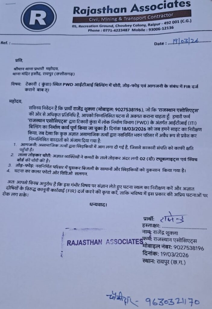रायपुर – मंदिर हसौद थाना क्षेत्र के ग्राम टेकारी में स्थित आई टी आई भवन में चोरी की घटना सामने आई है। ठेकेदार के अधिकृत प्रतिनिधि राजेन्द्र शुक्ला ने थाना प्रभारी को दी गई रिपोर्ट में बताया है कि 18 मार्च को साईट निरीक्षण करने पर पता चला कि खिड़कियों में आग लगाने का असफल प्रयास किया गया है और कमरे का ताला तोड़कर 02 ट्यूब लाइट व स्विच बोर्ड चोरी कर लिया गया है।